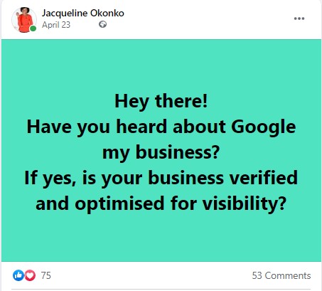 My name is Jacqueline Okonko. I am a Web Designer, a Hobby baker and a Certified Google My Business Expert.
